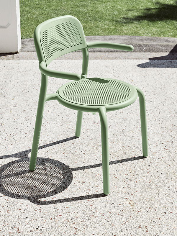 The armrests give it a fun, almost cartoonish look. Of course, the Toní’s hexagonal pattern in the seat and back is unmistakable. It’s nice and airy to sit on, with a nod to the classic bistro chair. Feel free to lift the Toní Armchair and discover how light it is. Comes in handy, as you can easily stack up to four chairs.