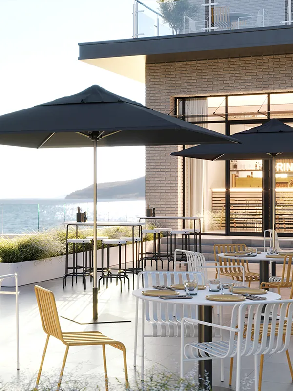The Cafe & Resort Umbrella is our market outdoor umbrella model, has been engineered to provide individualised shade. Easy to use and long lasting, it’s the perfect replacement to a budget wooden solution, lowering maintenance and replacement costs across the board will save you money in the long run.
